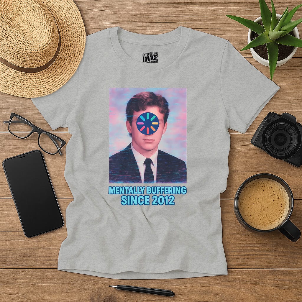 A timeless portrait of modern dysfunction. This nostalgic-meets-digital design features a retro yearbook-style photo with a colorful loading icon over the face and glitch effects that scream “I haven’t been okay in a while.” Paired with the phrase “Mentally Buffering Since 2012,” it’s perfect for those who’ve been stuck in a mental loading loop for over a decade.