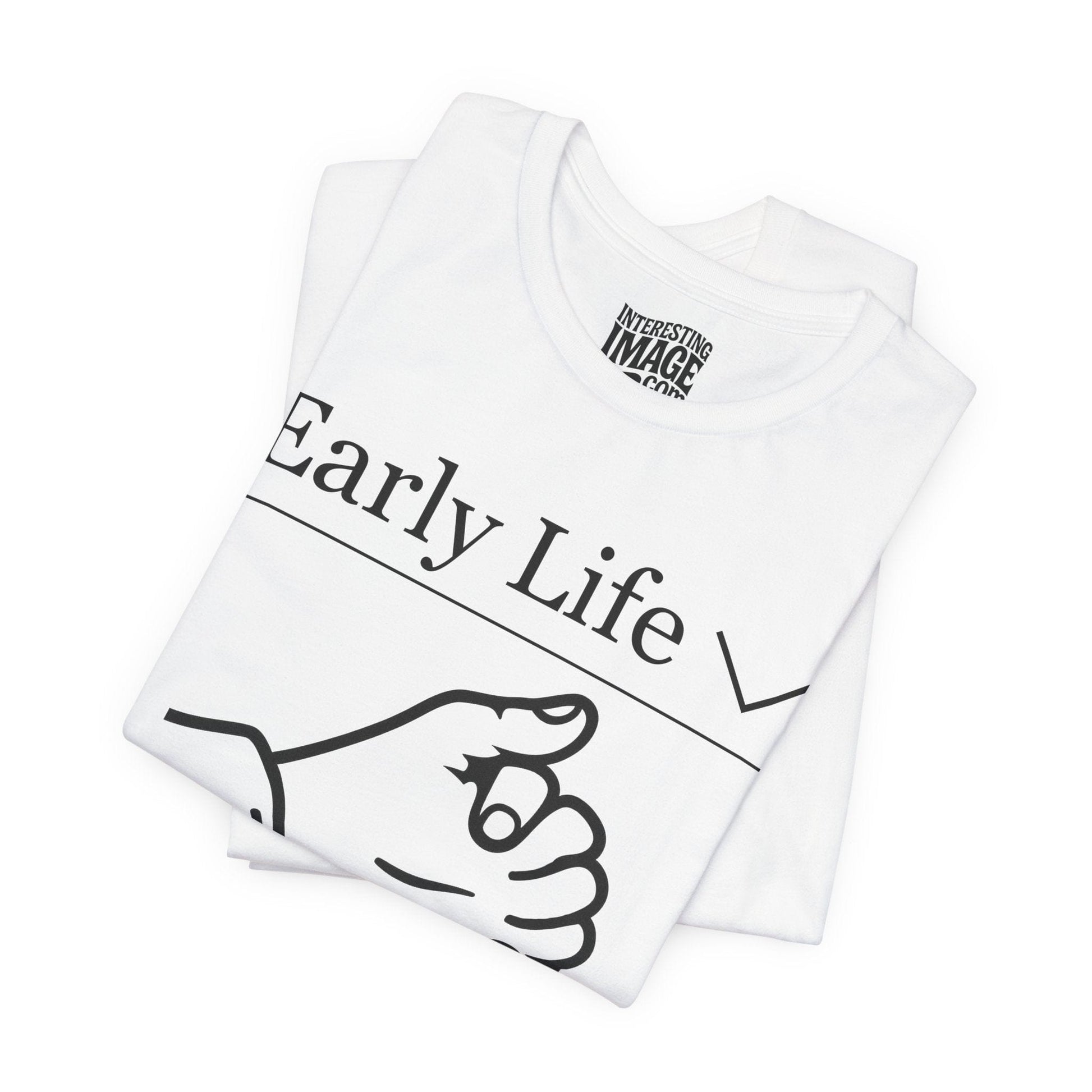Bold, minimal, and packed with dry humor, this t-shirt design features a simple black line drawing of a hand doing the classic thumb-and-fist "baby grabbing a finger" gesture—captioned with the subtle and slightly ominous phrase: “EARLY LIFE” above it. The minimalist art style and stark contrast give it a clever, ironic vibe—blending nostalgia with existential undertones. Whether you're into dad jokes, philosophy, or just like shirts that make people do a double take, this one's a low-key masterpiece of visual wit. Perfect for lovers of surreal humor and meme-style understatement.