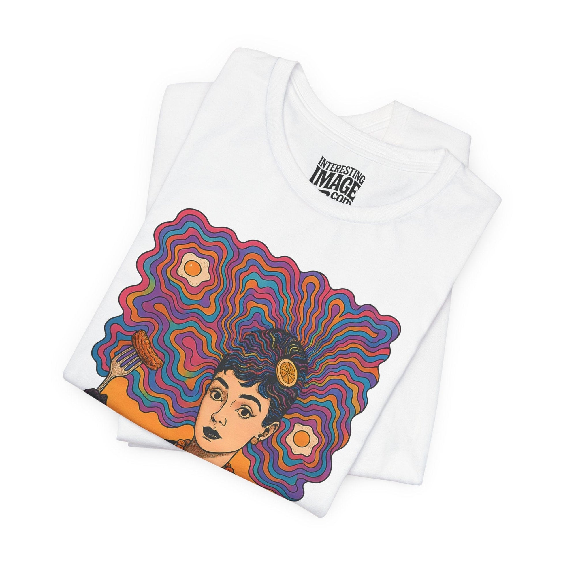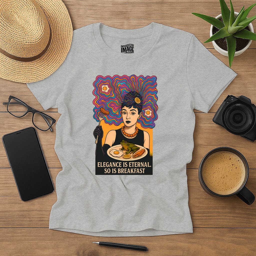 Where haute couture meets hot sausages. Elegance Is Eternal. So Is Breakfast. is a fabulously psychedelic tribute to timeless style and the most important meal of the day. Featuring a glamorously stoic woman with swirled rainbow hair, pearls, and a composed expression while holding a forked sausage and a plate starring a frog, this design plays with surrealism, vintage beauty, and absurd humor. For brunch icons, art nerds, and lovers of all things fashionably weird.