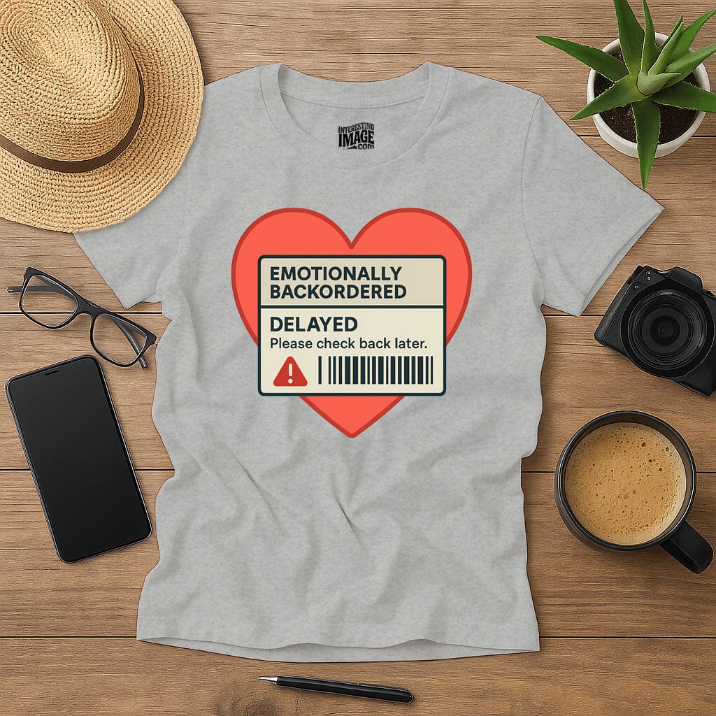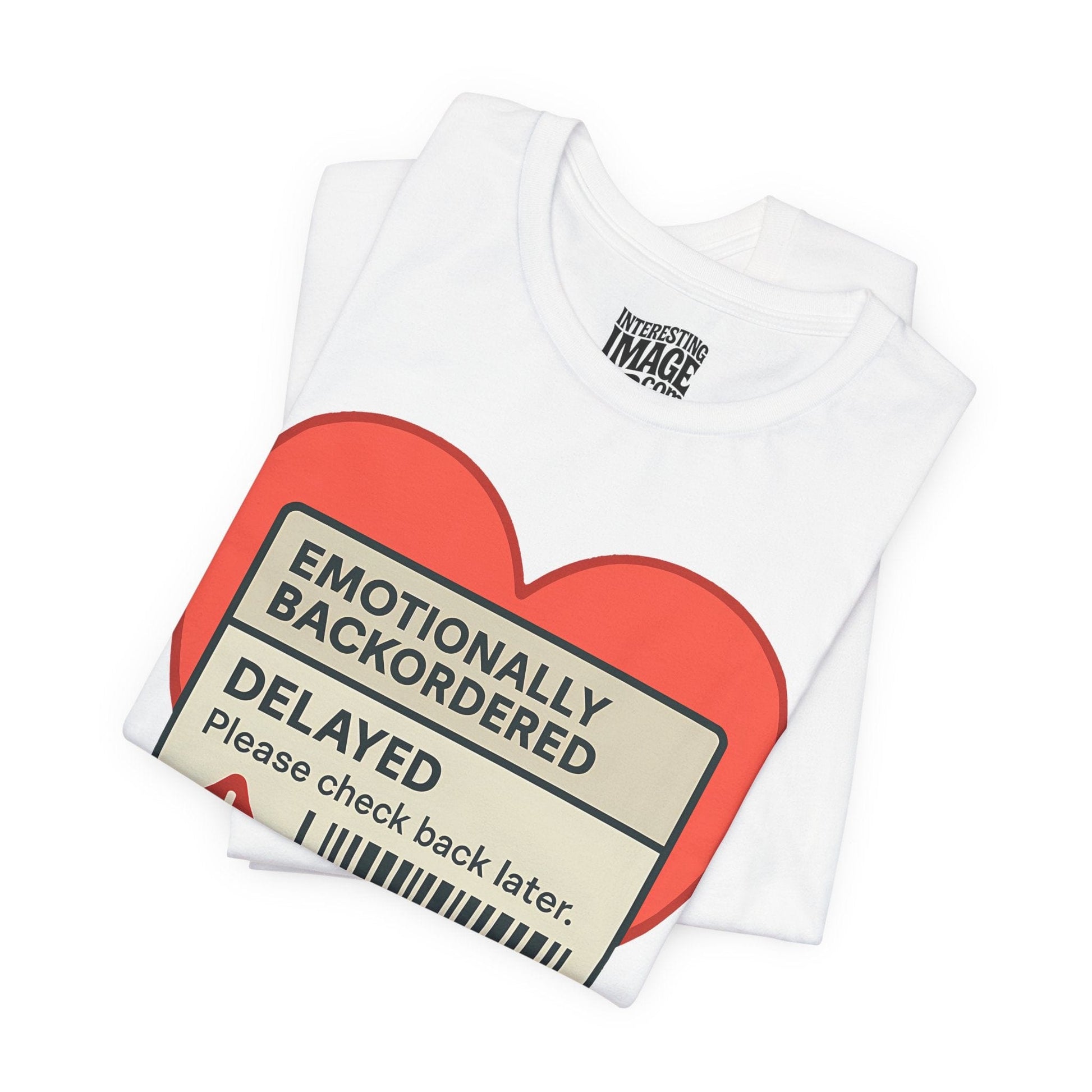 Sometimes the heart's just... on backorder. This clever design mimics a shipping label slapped on a bright red heart, reading “Emotionally Backordered – Delayed. Please check back later.” With its tongue-in-cheek barcode, warning icon, and clean graphic style, it’s the perfect blend of humor and emotional unavailability.