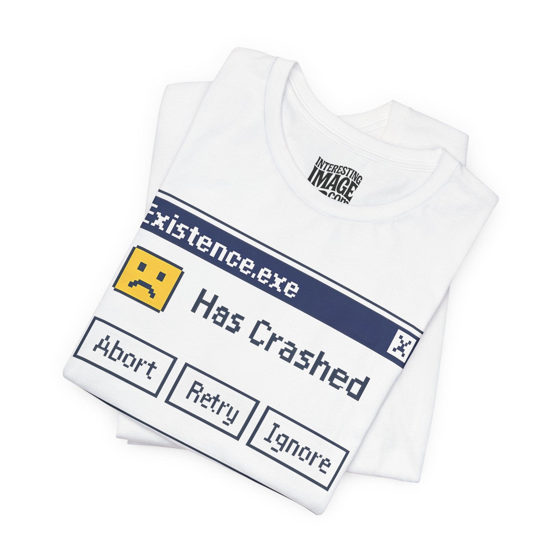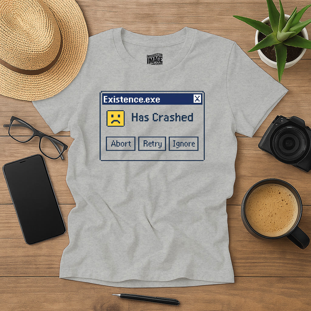 Glitch in the matrix? Mood. This pixel-perfect retro error window design delivers a hilarious existential punch, styled like a classic computer crash with a sad face and the dreaded message: “Existence.exe Has Crashed.” Whether you’re spiraling, buffering, or just vibing in low-power mode, this digital-age meltdown graphic is painfully relatable.