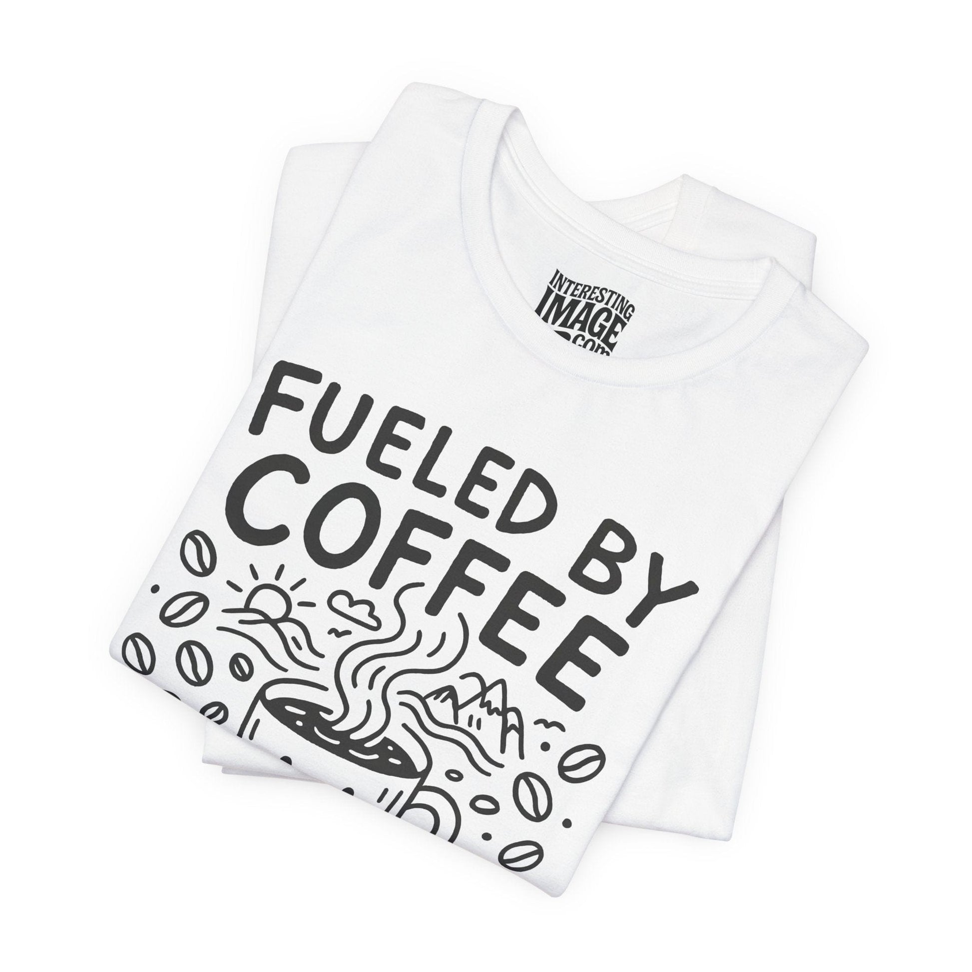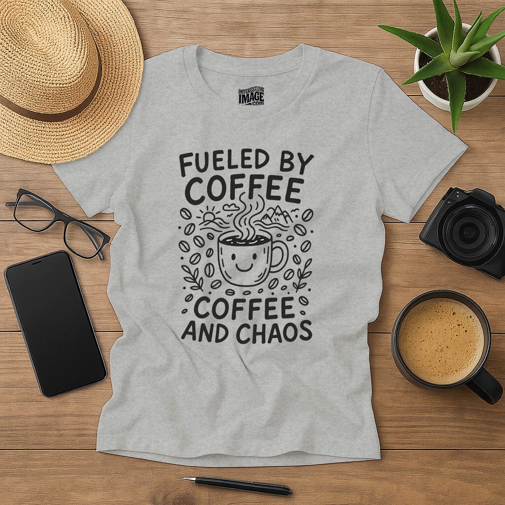 Start your day the only way that makes sense: with "Fueled by Coffee and Chaos!" This fun and charming graphic tee features a smiling coffee cup surrounded by coffee beans, mountains, sun, and leaves, capturing the true spirit of caffeine-fueled adventures. Perfect for coffee addicts, busy parents, students, office workers, and anyone thriving on a healthy mix of espresso and energy! Great for casual wear, coffee dates, or gifting to the chaotic caffeine lover in your life.