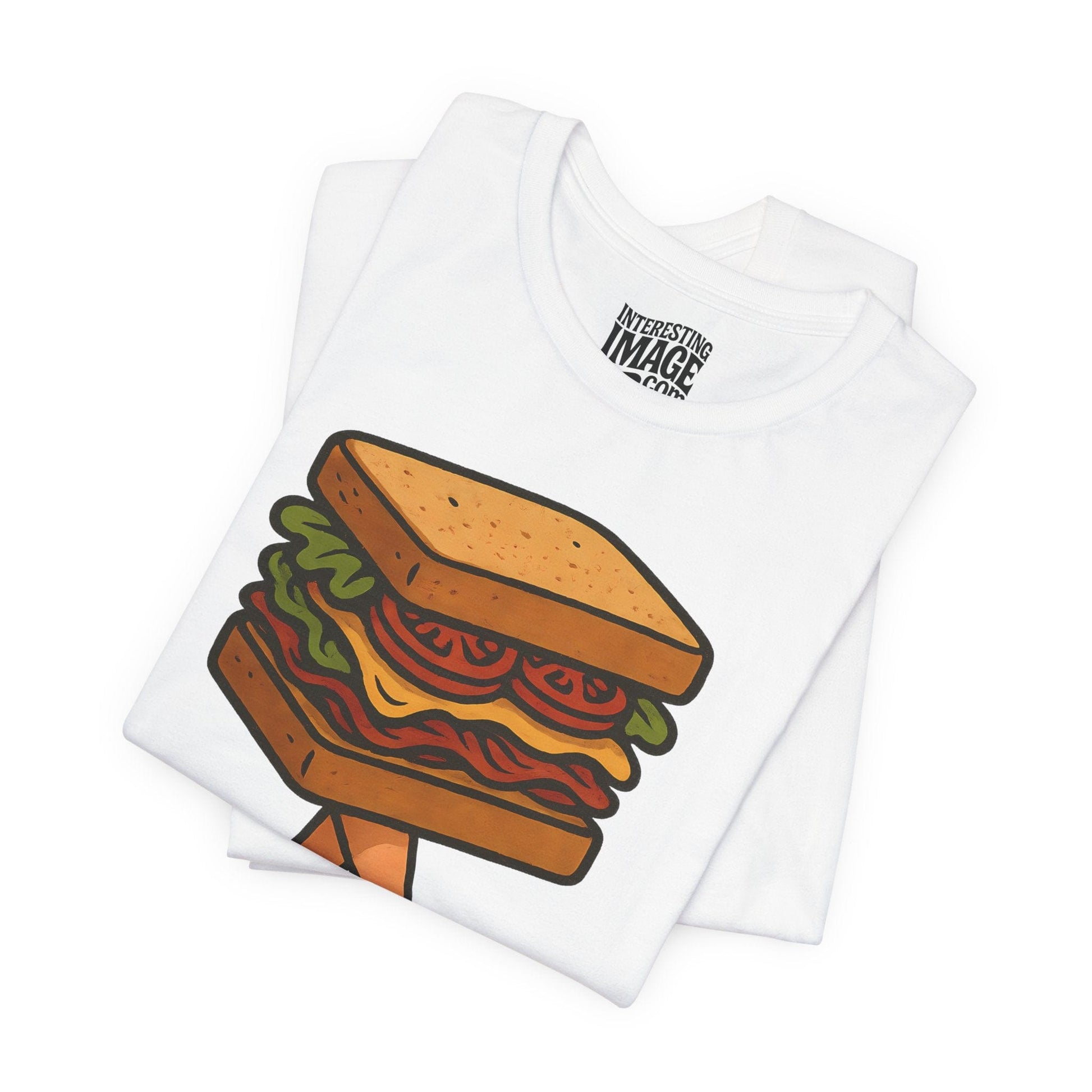 Serve looks and lunch with this delightfully absurd and stylish t-shirt design! Featuring a towering sandwich with luscious layers of lettuce, tomato, cheese, and deli meat—all strutting confidently on a pair of long legs in sleek high heels—this design is the perfect blend of food humor and surreal fashion flair. It's playful, bizarre, and oddly glamorous, making it a standout for fans of quirky art, Dada-style aesthetics, or anyone who’s ever wanted their sandwich to slay the runway. Equal parts snack and icon, this walking sandwich is serving everything.