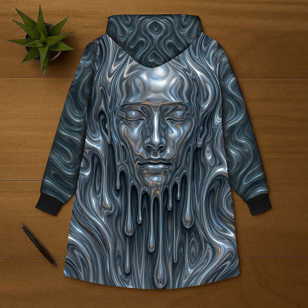 Immerse yourself in surreal elegance with Liquid Dreamscape, a hauntingly beautiful all-over print hoodie featuring a fluid metallic face melting seamlessly into rippling waves of dark, reflective textures. This mesmerizing artwork blurs the line between human form and liquid abstraction, evoking mystery, calm, and deep introspection. Perfect for those who walk the edge of art and fashion, this hoodie transforms wearable style into a moving canvas of emotion.