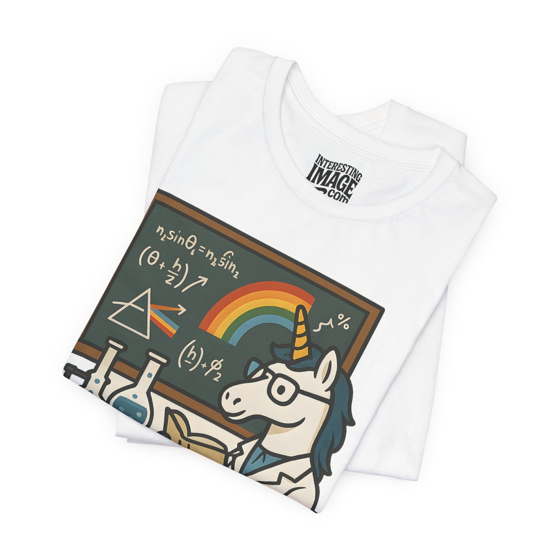 Where logic meets legend! This clever design features a unicorn scientist in a lab coat studying a textbook in front of a chalkboard filled with scientific formulas, rainbows, and physics diagrams—including a nod to Pink Floyd’s iconic prism. Surrounded by bubbling flasks, the image is captioned with the perfect literary pun: “MAGICAL REALISM.” Ideal for science geeks, book lovers, fantasy fans, and pun connoisseurs who believe that a little magic belongs in every equation.