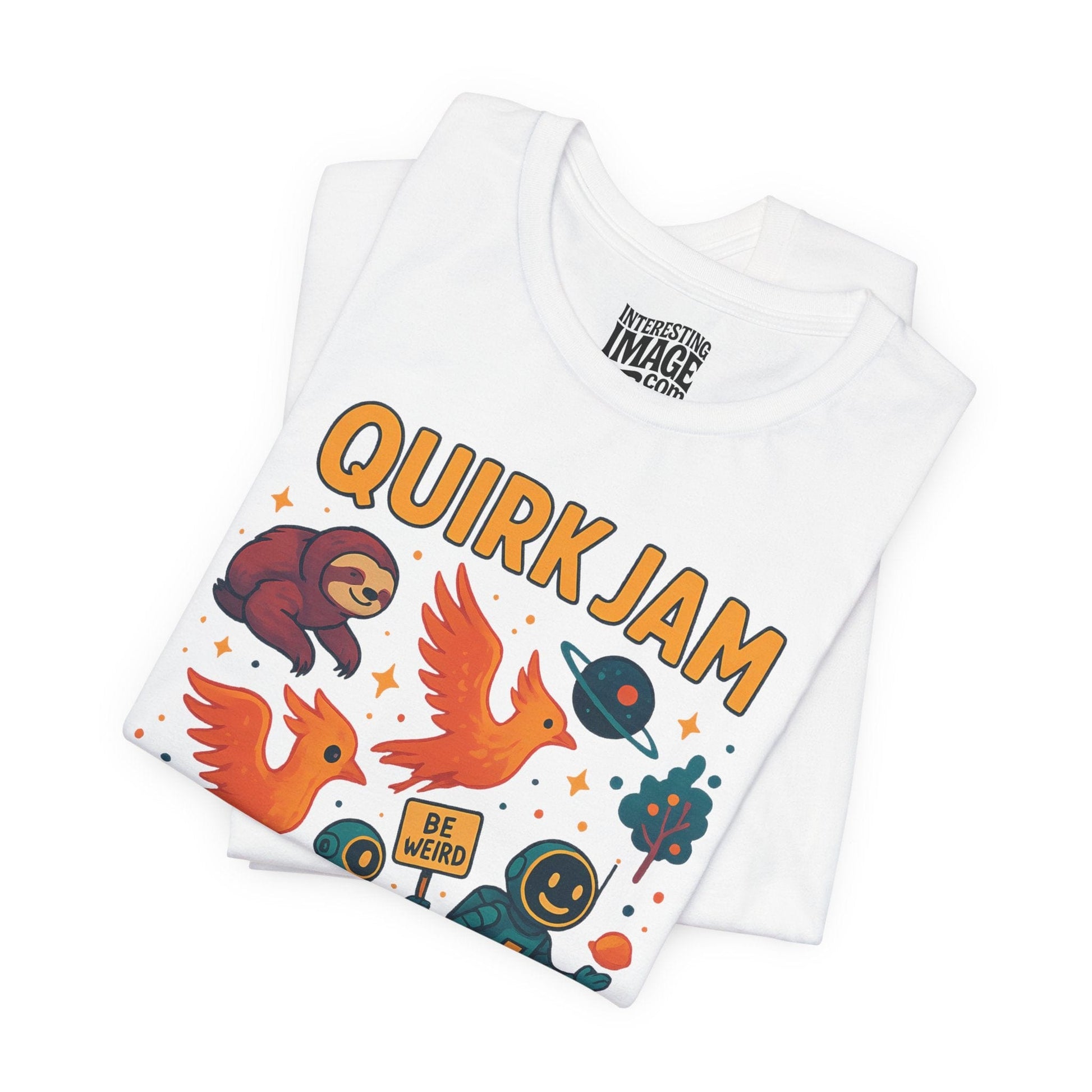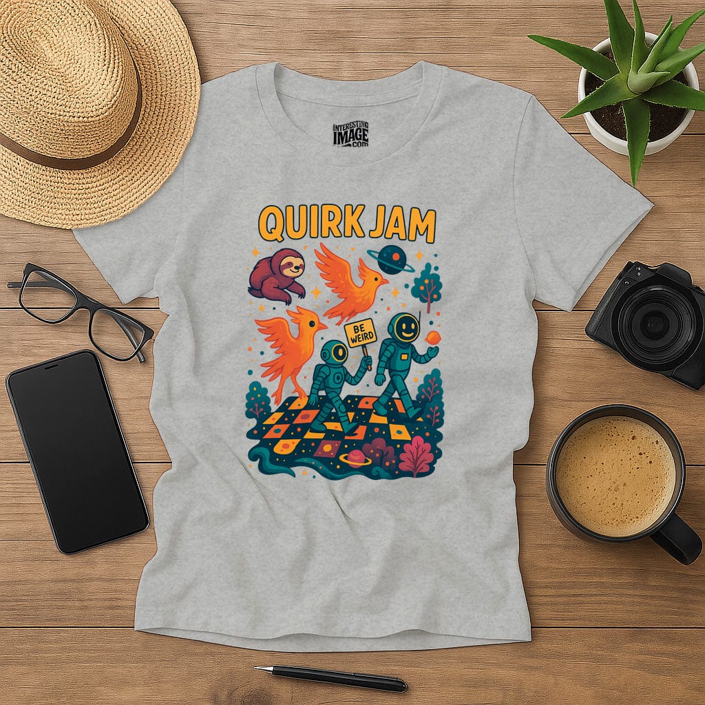 March to the beat of your own galaxy! "Quirk Jam" is a colorful cosmic crossover where space explorers, flaming birds, happy robots, and a turbo-charged sloth unite in the ultimate intergalactic parade. With bold retro colors, psychedelic space vibes, and a cheeky "Be Weird" sign, this design celebrates the joy of being different. Perfect for weirdos, wanderers, and anyone who dances through the stars.