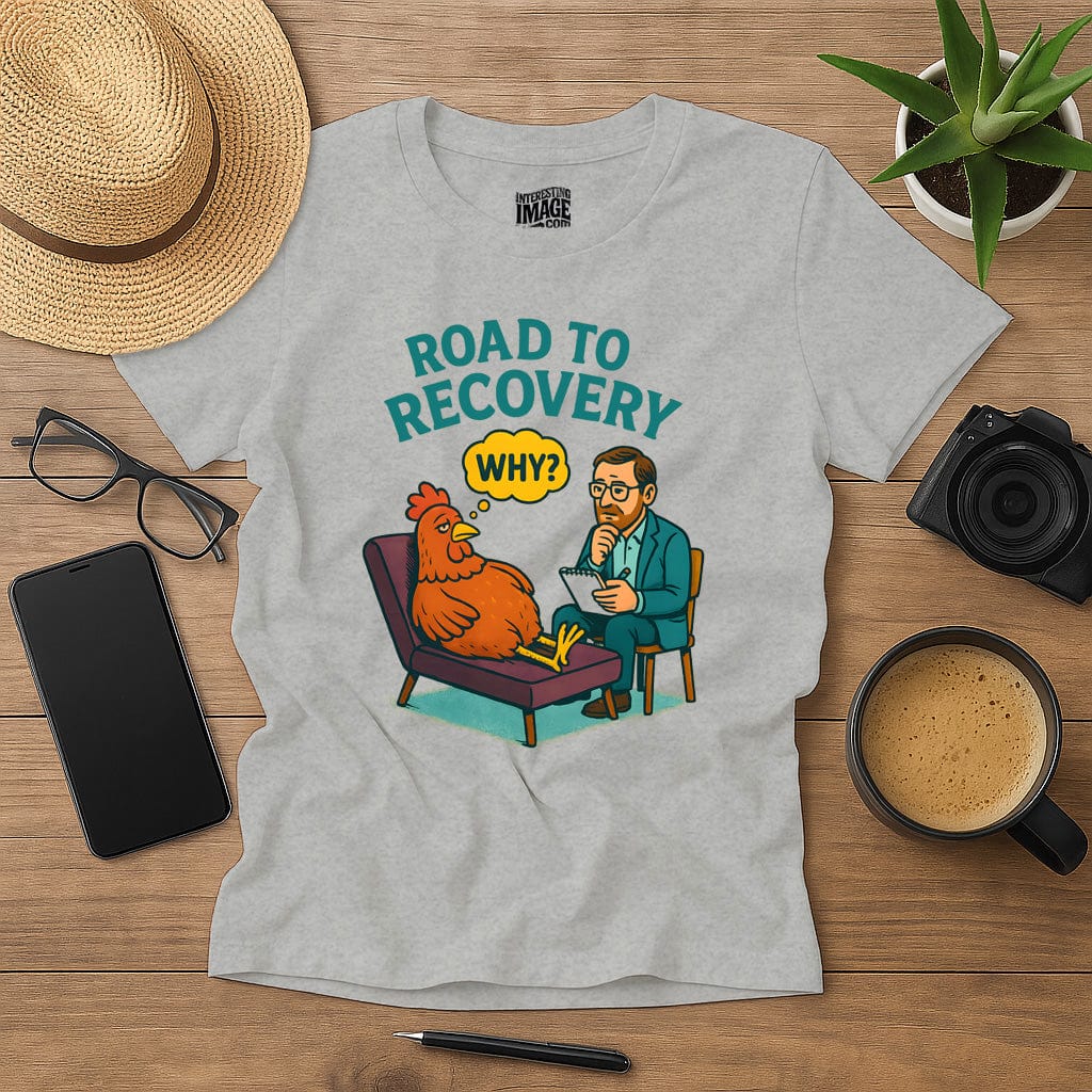 A hilarious twist on classic therapy tropes, this design features a perplexed chicken reclining on a therapist’s couch, grappling with the age-old existential crisis: “Why?” With the phrase “Road to Recovery” looming above in bold letters, the scene plays out like a vintage cartoon, packed with expressive detail and dry wit. Perfect for fans of dark humor, animal cartoons, and anyone who loves a clever play on words—or just needs a laugh on the road to self-discovery.