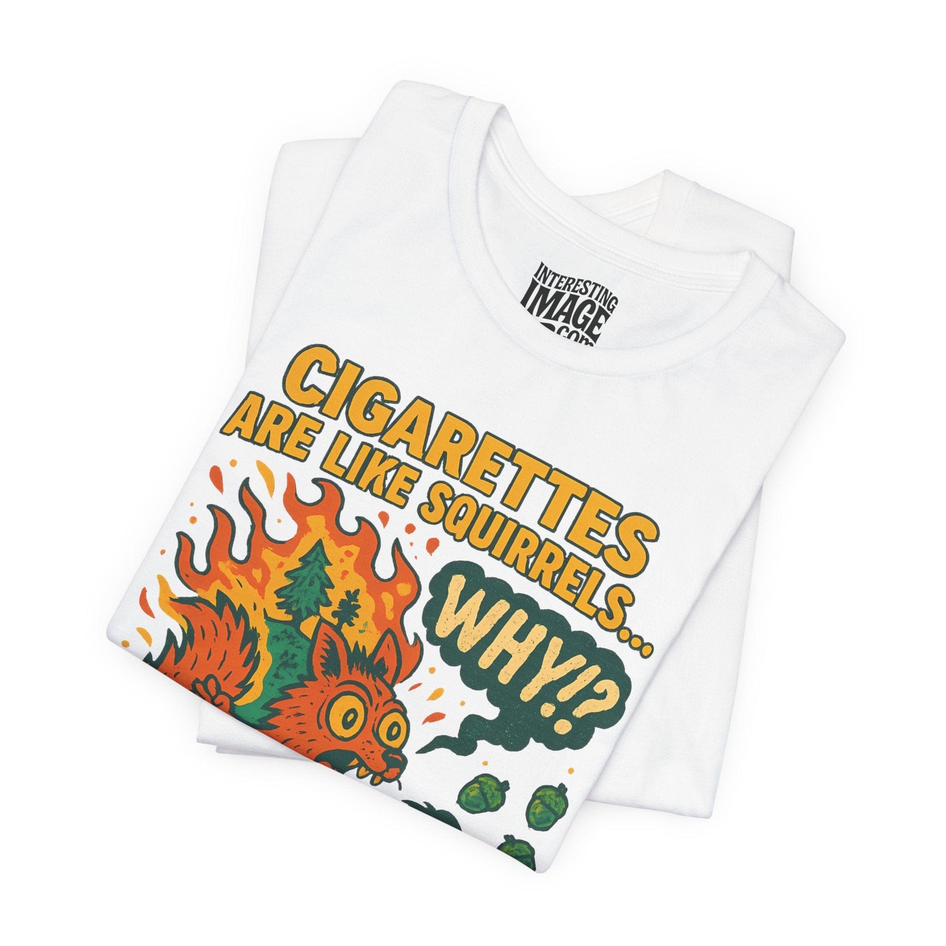 This hilariously twisted T-shirt flips anti-smoking messaging into surreal comedy gold. Featuring a cartoon squirrel mid-freakout as it's accidentally lit on fire, this design plays off the viral quote: